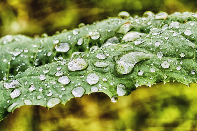 Лист в лесу после дождя. Капли на листе пасмурным утром. Весь в каплях. Капля к капле.. Одна сейчас стечет с листа..Капли крупным планом, в режиме макро.