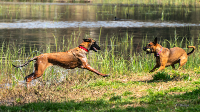 Собаки соревнуются — кто первый достанет мяч из воды.