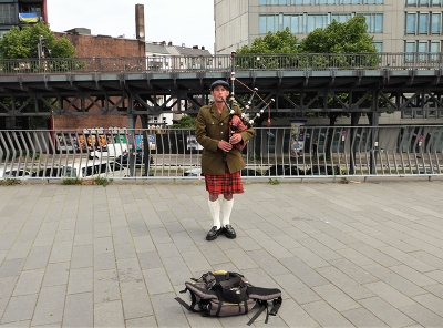 На фото музыкант, играющий на волынке в порту. Народу полно, гуляют по набережной за моей спиной и рядом с музыкантом. Я выбрала момент, чтобы на фото был только он