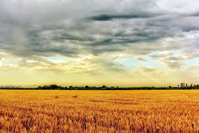 Ранним утром на поле. Поле с пшеницей. Когда утром теплый свет.. И темная туча. Когда погода меняется на глазах. И набежали тучи, к дождю.. Свет, утренний свет. После рассвета на поле.