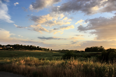 Вечер, деревья,трава в лучах уходящего, небо,облака