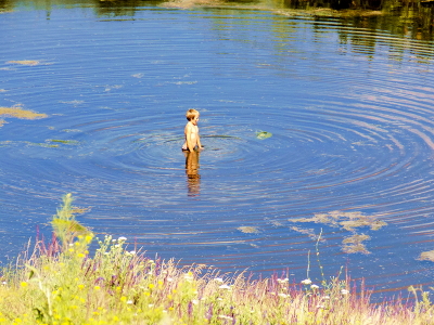 Река, маленький пацан хочет нырнуть
