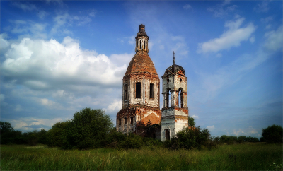 Урочище Федотово. Вид на полуразрушенную Знаменскую церковь. Вечер. Июль.