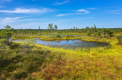 Марина Мочалова, Около 40 тыс гектаров занимают в Латвии Кремерские болота. Я здесь впервые увидела несколько видов росянок. На фотографии на п.п. красные "островки" среди зелени - это они и есть.