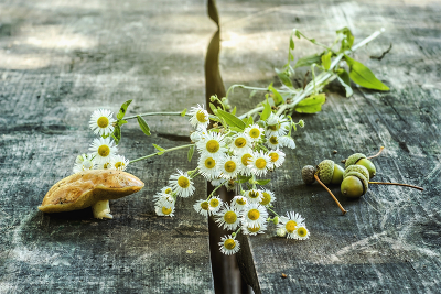 Дары природы.. Живой натюрморт.. Дары леса на столе в лесу. Утром в лесу составляем натюрморт из даров природы. Лесные цветы, ромашки, гриб масленок, и желуди. На столе в дубовом лес дары природы, живой натюрморт с цветами. С лесными ромашками. Расположены на досках стола в лесу. При утреннем свете проникающем в лес. Естественное боковое освещение всех предметов, при солнечном сете в лесу утром.. |