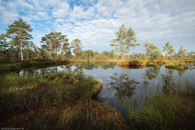 "Августовская весна" Обычно к середине августа на болоте уже начинают появляться осенние краски. Однако в тот год пик жаркой погоды пришелся на июль месяц, болота пересохли. А в августе пошли дожди, после чего всё покрылось зеленью |