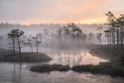 "Сезон туманов" Принято считать, что сезон туманов на болотах Ленинградской области приходится на август-сентябрь. Действительно, в это время туманы наиболее вероятны, но если повезет то можно застать их в любое время года. В это году в начале июня погода как нельзя лучше благоприятствовала появлению туманов |