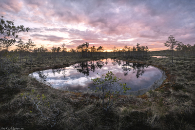 "Болотное озерко" На некоторых болотах целыми россыпями встречаются озера. Некоторые из них представляют просто залитые водой мочажины, тогда как другие бездонны и называются окна. Где-то в глубине они соединяются друг с другом, образуя водяное ядро болота |