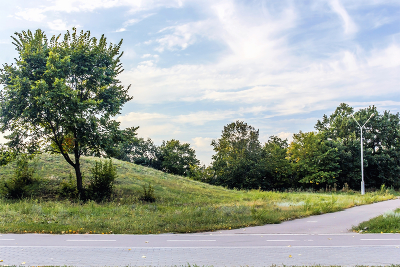 Беговая дорожка утром, с отводом.. Пригорок дерево зеленое в августе и дорожка отведенная вдаль. Утром после рассвета на беговой дорожке и облака..