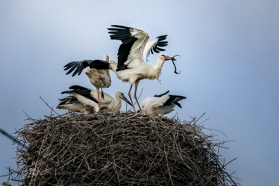 Уже взрослые птенцы, но пока родители их кормят. В этот раз принесли ужа.