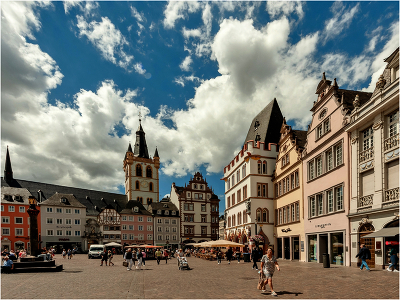 Рыночная площадь города Трир Площадь Хауптмаркт, также называемая Главной или Рыночной площадью, является центральной и одной из самых больших в Трире. Она находится в историческом районе на пересечении важнейших торговых улиц средневекового Трира. В 958 году по распоряжению Генриха I, архиепископа трирского, на площади Хауптмаркт был установлен так называемый Рыночный крест: каменная колонна, с крестом наверху - символ суверенитета, особых привилегий для развития торговли и власти церкви над городом. |