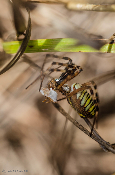 ПАук в деле Всего у паука 6 пар конечностей: 4 пары считаются ногами и 2 — челюстями. На фото паук аргиопа самка. Педипальпы довольно короткие, больше напоминают щупальца. Именно из-за сочетания черного и желтого цветов, выраженного полосами и на теле и на ногах, аргиопу называют «паук-оса» |