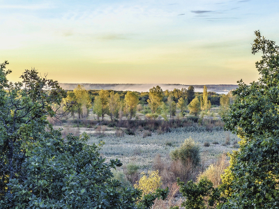 Когда приходит рассвет, и утренний свет освещает местность. С возвышения взглядом на местность. Естественная рамка из деревьев по бокам.. Свет утра, и немного облаков..