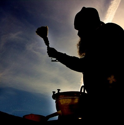Сначала показалось, что у такого грозного батюшки - маленькая левая рука... Потом понял - что всеж метелка - в правой...