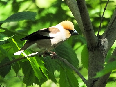 Дубонос возмущен наглостью воробьев ,которые полезли в кормушку впереди него