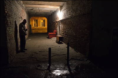 Витебск. Человек вышел покурить в проходе ведущем в Октябрьский проезд.