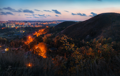 Ночной Старый Оскол Закат уже почти затих, в синеве сумерек тёплые огни фонарей уютно освещают улицы у подножья холмов. Виды на город с Казацких бугров. Район слободы Гумны. Город Старый Оскол. Сентябрь, 2022 года. Из фотопроекта "Земля Белгородская». |