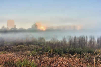 В море тумана... Когда солнце поднялось над горизонтом.. Окраина города на возвышении в море тумана. И солнечный свет отраженный от стекол окон через туман.. Проглядывает пятнами света... Туман полосой над заболоченной местностью. |