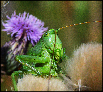 Не доверяя своим глазам. Кузнечик зеленый - Tettigonta viridissima. Длинные усы позволяют кузнечикам исследовать окружающий мир. В данном случае усик исследует переднюю линзу объектива на предмет опасности. |