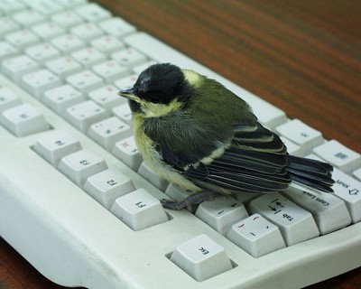 Это желторотик учился летать, влетел в открытое окно, на клавитуру сами посадили потом на дерево лазили с семочками домой отправили с гостинцем