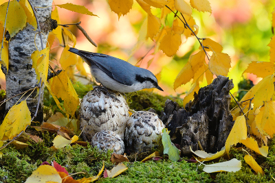 В осеннем лесу А в лесу с каждым днем все меньше вкусных жуков, аппетитных личинок, слизней, пауков. В октябре они все уже забрались в разные укрытия, зарылись в лесную подстилку. Поползни, питающиеся летом насекомыми с лиственных деревьев, осенью, с удвоенным усердием обыскивают сейчас и хвойные, и кусты, и траву, и лесную подстилку, пока снег не спрятал её до весны. Но едят и семена, и плоды, которые собирают даже на снегу. |
