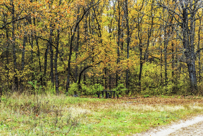 Утро в осеннем лесу в октябре. Пасмурно. Рассеянный свет. Среди леса. Стол со скамьей для отдыха. Под осенними ветвями деревьев в лесу.. В красках осеннего леса.