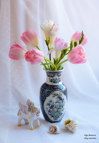 Тюльпаны и фрезии в японской вазе