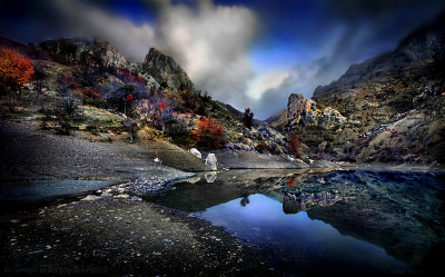 Красивый Зеленогорский хаос в поздних сумерках Озерцо «Панагия» в Зеленогорье. Za 30 sек. - хмурая темнота превращается в живописные с изысканными цветами сумерки. Экскурсии в эти места почти не проводятся, и только истинные любители природы, уединения или экстрима добираются до озера самостоятельно. Весь окружающий пейзаж настолько прекрасен, что кажется вышедшим из сна или сказки! Достопримечательности Крыма. Фото городов и пейзажей Крыма. |
