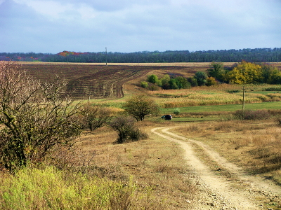 Осень, дорога,поля,кусты,деревья