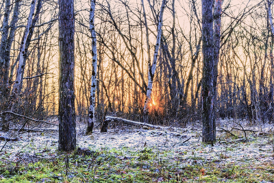 Когда приходит рассвет в лес.. И выпал немного снег. Солнечный свет рассвета через стволы деревьев. В природе когда приходит зима..