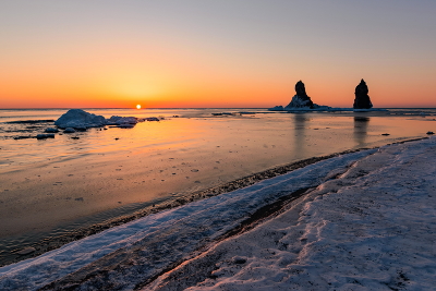 Восход у Двух Братьев Северо-восточное побережье Приморья. Два Брата - два живописных одиночных кекура недалеко от берега, примерно в одном километре от мыса Бринера на юг. В свое время удостоились быть запечатленными на рублевых купюрах, еще до деноминации... 27.02.21 Заранее спасибо за уделенное внимание, оценки, комментарии... |