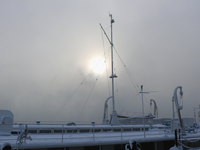 мороз минус 39 , вода в Енисее не замерзает, от этого густой туман, прогулочные теплоходы прикованы к берегу