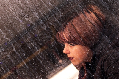 За грязным окном автобуса.