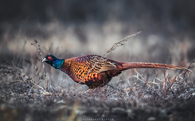 Выйдя ради поиска пропитания из спасительных зарослей на открытое пространство и заметив меня фазан ведет себя весьма настороженно...