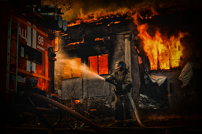 Точка кипения Фото сделано на боевом пожаре. Горели старые деревянные гаражные боксы. Температура вокруг критическая. Приходилось охлаждать даже пожарные машины. |