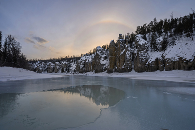 На реки Синей Якутия. Река Синяя (якут.СИИНЭ). Левый приток реки Лены. На берегах этой реки находится 37 групп скал, которые тоже называют "столбами". В основном сюда едут летом, поэтому зимних кадров с этой реки довольно мало. В марте лед начинает "садиться" - раздается сильный треск и реально становится немного напряженно, когда стоишь на реке. Лед начинает выдавливать воду на поверхность, где она подмерзая образет наледи. На кадре как раз такая наледь, под слоем воды почти метровый лед. А вот у края берега надо быть повнимательней - можно провалиться почти по пояс. |