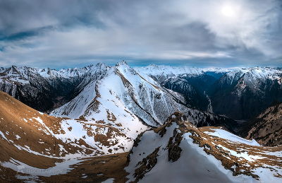 Апрельские горы Тёплый, солнечный день. Справа долина реки Большой Зеленчук и виднеется дорога на Архыз. Слева долина реки Маруха. По центру, в снегу, гора Большой Карабек. Из фотопроекта «Кавказ без границ». |