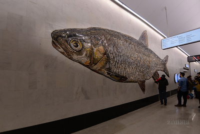 станция метро Нагатинский затон. На стенах рыбы, обитающие в местных реках
