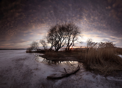 конец марта, на озере тает лёд, закат, остров камышовый, минское море
