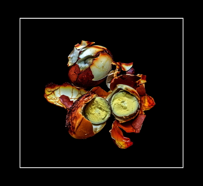Жена красила яйца (луковой шелухой) к Пасхе, некоторые лопнули при варке. Забрал их на работу для съедения; когда чистил, фактура показалась интересной, снял))