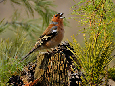 Весенние песни Чем старше самец, тем разнообразнее его песни, так как со временем накапливается опыт, перенимают у сородичей, других видов. Неосторожно птица себя ведёт во время пения. Увлекаясь трелями, самец зяблика поднимает и откидывает голову назад ничего и не видя, не слыша вокруг. |