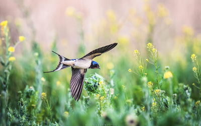 После прошедшего дождя деревенские ласточки дружно переместились с водоема, над которым они до того летали, в поле.