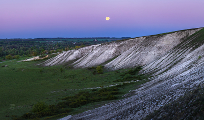 Меловые холмы при весенней луне на рассвете.