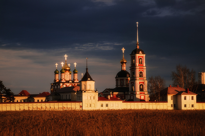 Варницкий монастырь в закатном золоте Подъехав к монастырю, нам нарисовалась довольно унылая картина. Было пасмурно, тучи заволокли всё небо, не давая солнцу пробиться. Только на западе между тучами был просвет, оставляя надежду, что имеенно туда и опустится солнце на закате. Что и произошло через пол-часа. Солнце опустилось именно туда. |