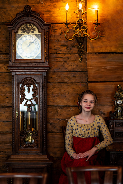 Но , как то надо отвлечь от взгляда в объектив .. Может книгу или еще внимание перенести на другой предмет ? Вышивание ? Рукоделие ? Гончарное дело ? В таком наряде это будет вполне уместно .