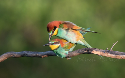 Брачный период у щурок золотистых . Встало солнце , свет , момент , объекты .