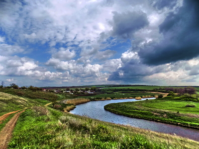Поворот реки, начало села, небо