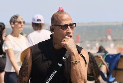 Оригинальный дядя - весь в тату и с розовым хохолком...