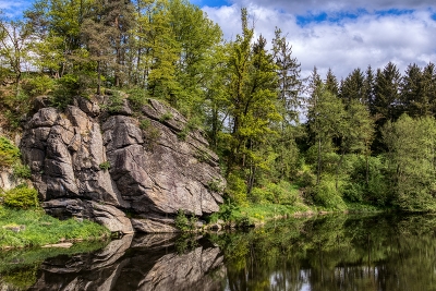 bewachsener Kletterfelsen spiegelt sich im Fluss