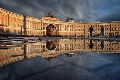 Дворец выделяется ярко на фоне пасмурного неба и красивое отражение!